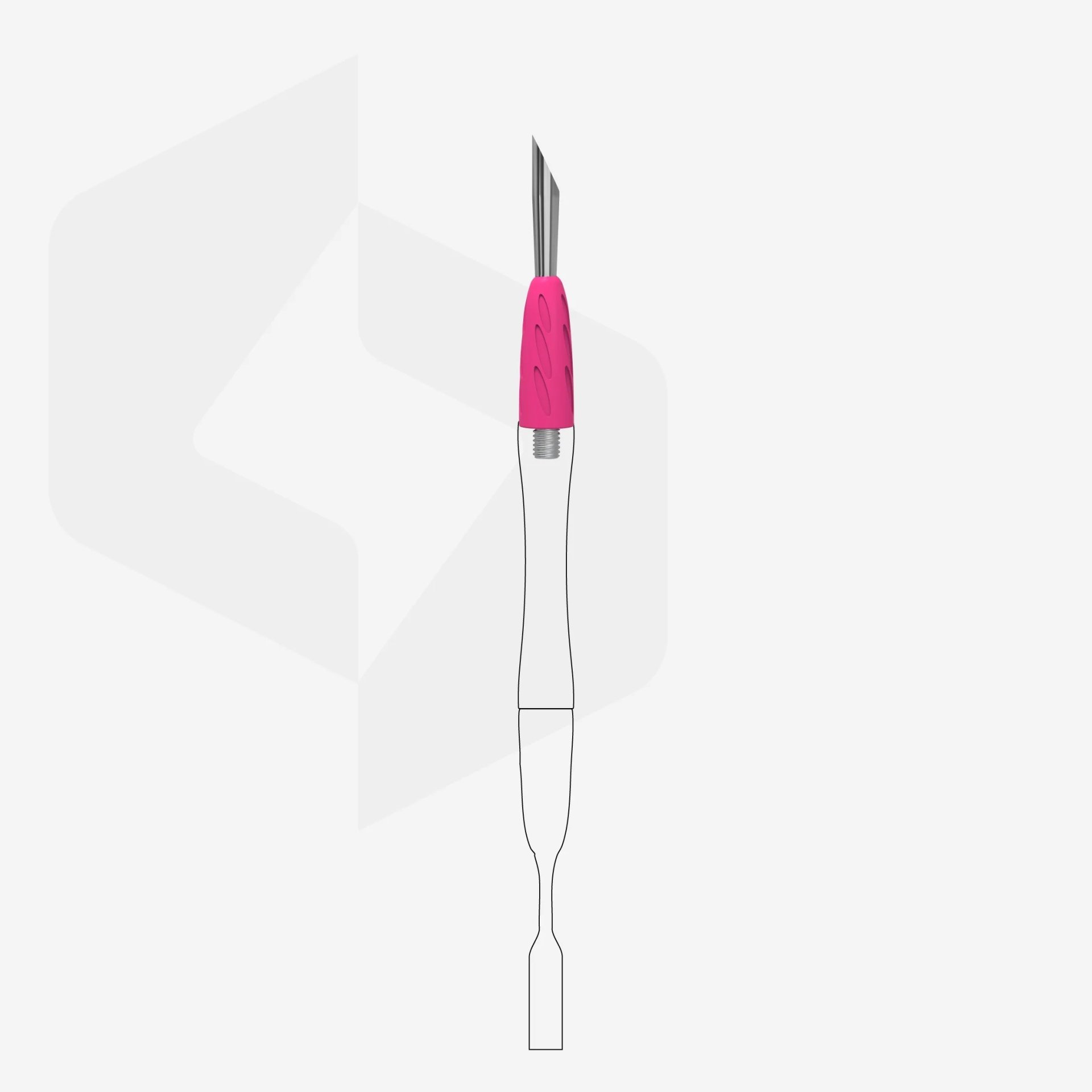 - „Kopytko skośne” w kształcie metalowego patyczka pomarańczowego jest do uniesienia i odsunięcia mocno przyklejonych i szorstkich skórek, oczyszczenia wolnego brzegu paznokcia oraz usunięcia nadmiaru lakieru hybrydowego podczas wykonywania manicure i pedicure